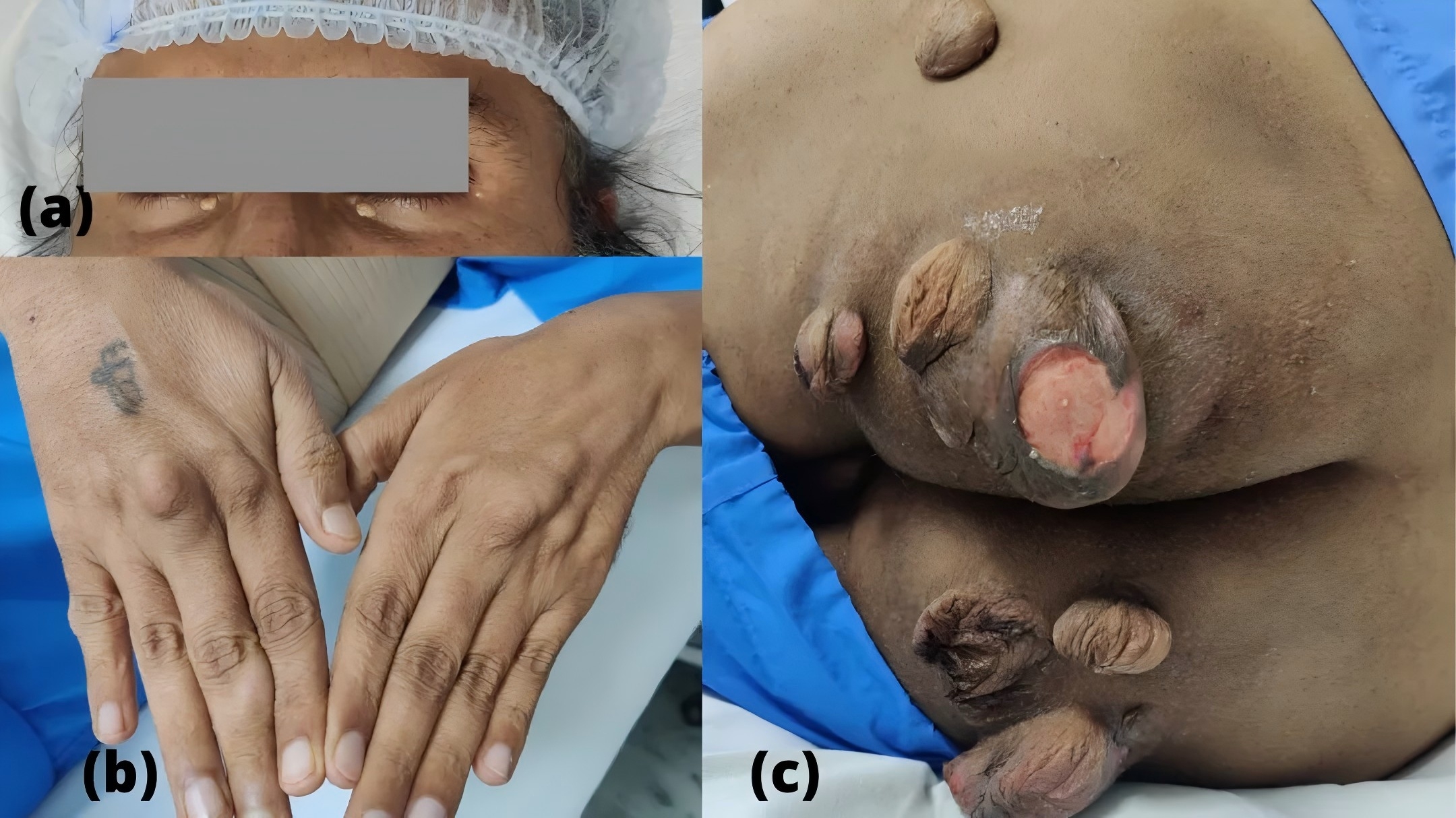 诊疗过程:入院查体见双侧肘、膝关节黄色瘤,生命体征异常。实验室检查多项指标异常,心电图提示心肌缺血,肌钙蛋白阳性,诊断为非 ST 段抬高型心肌梗死。超声心动图显示中度二尖瓣反流及左心室收缩功能障碍。因低血压放置主动脉内球囊