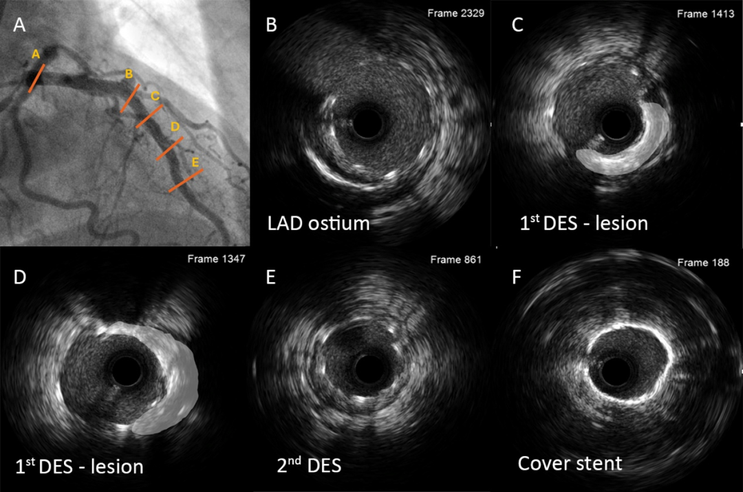 病史摘要:47 岁女性,有不明原因反复发作心脏骤停史(已植入 ICD)、哮喘及吸烟史。此次心脏骤停前数小时出现胸痛,既往静息时偶发胸痛,含服硝酸甘油可缓解。约 3 年前首次心脏骤停,当时诊断为冠状动脉痉挛,予单硝酸异山梨酯治疗并植入双腔 ICD。7 个月前再次胸痛伴 ICD 放电,检查发现右后侧支慢性闭塞等。患者为吸烟者,有饮酒习惯,近期压力增加,家族中有多位猝死病例。