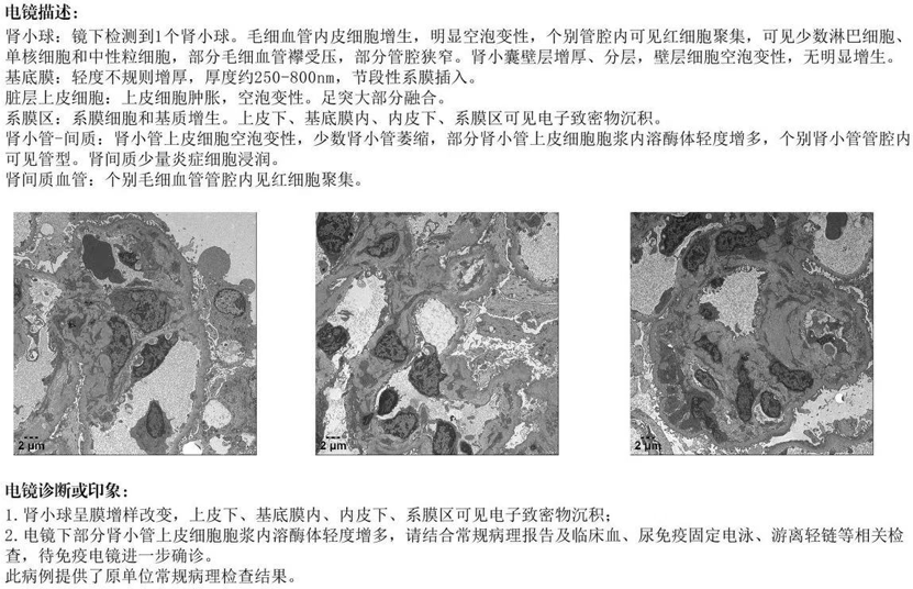 病史摘要:53 岁男性患者,因“慢性肾病随访”就诊。现病史有肾病范围蛋白尿、双下肢凹陷性水肿。既往患 2 型糖尿病 20 年,接受胰岛素治疗,伴有糖尿病非增殖性视网膜病变、高血压、慢性肾病 3 期及良性前列腺增生。诊疗过程:实验室检查肌酐 254mmol/L 等,尿液分析有镜下血尿、尿蛋白 3+等。肾脏超声双肾大小正常等。肾活检光镜符合局灶性增殖性肾小球肾炎及糖尿病肾病特征;电镜系