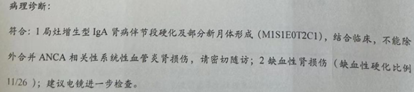 病史摘要:34 岁女性,主因“发现血肌酐升高 2 月余,尿检异常半月余”入院。2 月余前因贫血就诊发现血肌酐升高,伴咳嗽、咳痰等,间断中药治疗,复查血肌酐、尿蛋白等指标有波动。既往无高血压等病史,有剖腹产史。自发病以来,精神、食欲尚可,睡眠欠佳。诊疗过程:入院查体生命体征平稳,无明显阳性体征。化验提示多项指标异常,血 P-ANCA 弱阳性等。胸部 CT 等检查有相应异常。肾穿刺病理