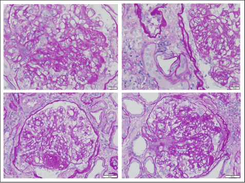 病史摘要:12岁西班牙裔女性患者,2022年确诊全身型幼年特发性关节炎(sJIA),接受托珠单抗治疗后病情控制良好。2023年(sJIA诊断后1.5年,病情稳定11个月时)首次出现蛋白尿,2024年尿蛋白/肌酐比值(UPC)持续在1 - 1.5 mg/mg。