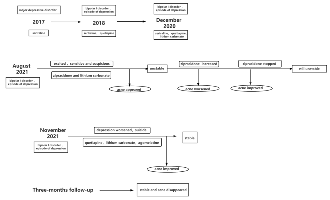 病史摘要:23岁女性患者,有5年双相情感障碍病史。既往无痤疮病史,本次入院前3个月使用齐拉西酮治疗后出现痤疮,齐拉西酮加量后皮疹加重,伴有炎性因子水平升高,自行停用齐拉西酮后皮疹减轻。患者曾多次调整药物治疗双相情感障碍,病情不稳定且有自杀行为。诊疗过程:入院时体格检查发现左前臂旧缝合线瘢痕、面部散在痤疮,神经系统无异常。实验室检查血常规、肝肾功能等指标未见明显异常,炎症因子部分指标