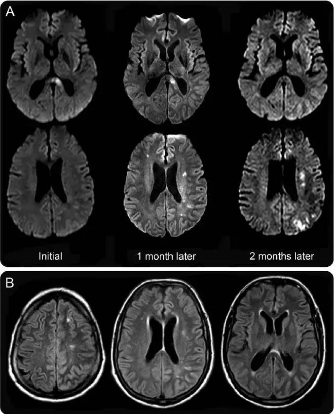 下图A,不同时期DWI影像,提示不同时期梗死灶逐渐增加。下图B为Flair。