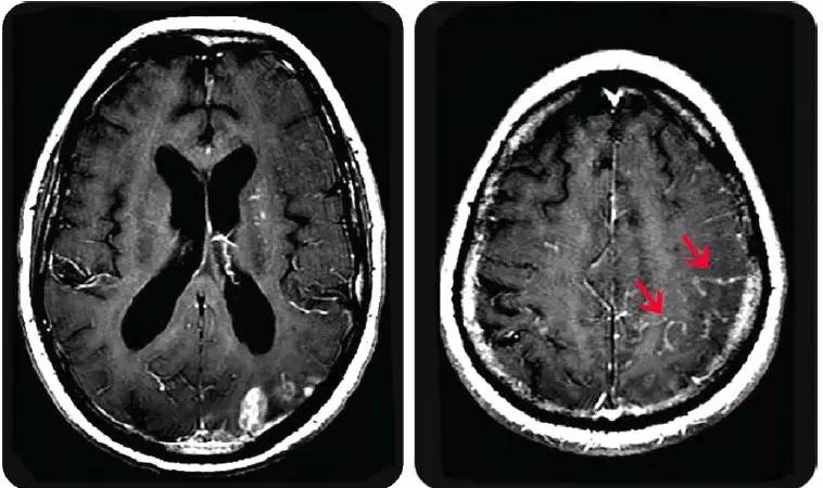 增强扫描显示软脑膜强化(主要位于左侧额颞),提示蛛网膜下腔内的血管受累。