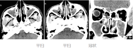 十年,加重1年。双侧鼻腔及双侧上颌窦内可见异常密度影,平扫呈低密度,内可见多发斑片状稍高密度影。病变边界清楚,形态不规则。