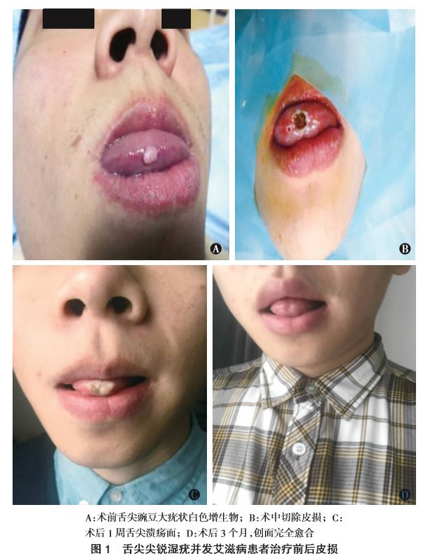 患者男, 25 岁。因发现舌尖赘生物 15 d, 于 2015年 5 月 6 日来四川洲际胃肠肛门病医院就诊。患者 15 d 前发现舌尖赘生物, 约豌豆大,呈白色, 质硬,有明显异 物感,无明显疼痛及瘙痒等不适,逐渐长大。自诉在多 家三甲医院就诊后,诊断为舌尖尖锐湿疣,因部位特殊 均拒绝手术治疗,患者为此病郁郁寡欢,辗转到我院就 诊,要求手术治疗。患者艾滋病病史 4 年余,长期服用 齐多夫定