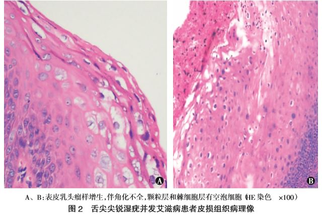 组织病理:表皮乳头瘤样增生,伴角化过度, 角化不全,棘层肥厚,角质层、颗粒层和棘细胞层有空泡细胞(图 2A、 B);免疫病理:人乳头瘤状病毒(HPV) 呈阳性;HPV-DNA 基因分型为 HPV6 型。 诊断:舌尖尖锐湿疣并发艾滋病。 治疗:局部麻醉下行舌尖尖锐湿疣电凝电切术 (图 1B)。术后口服抗生素 3 d,每日口腔中药保留漱 口(中药为课题协定处方,主要成份:重楼 30 g、黄柏 15 g、苦参 15 g 等,每日 1 剂,水煎 200 mL,分多次保 留漱口,每次 20~30 min)。患者 1 周后创面痂壳脱落, 形成溃疡面(图 1C),出院后继续口腔中药保留漱口 治疗。患者术后 3 个月随访时创面完全愈合(图 1D)。 目前治疗效果满意,舌尖外观及功能无影响,患者仍 继续中药保留漱口及随访中。