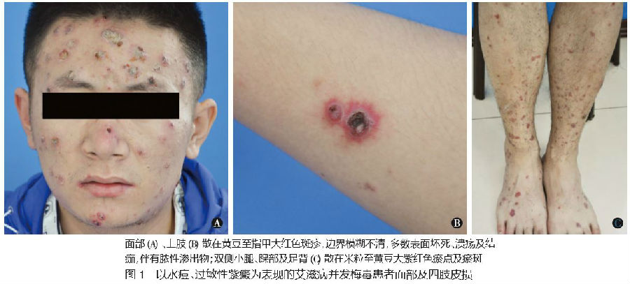 过敏性紫癜是一种累及皮肤及其他器官的毛细血 管及细小血管的系统性血管炎,大多数并发艾滋病患 者会出现 CD4 细胞计数的下降和丙肝病毒的感染,过 敏性紫癜并发艾滋病同时感染乙肝病毒的患者也有报 道[6],在抗逆转录病毒治疗后,临床病情可得到改善[7]。 HIV 和(或)AIDS 伴发梅毒、水痘均有文献报道,但 HIV 和(或)AIDS 并发过敏性紫癜[8]且乙肝病毒表面抗原、丙肝病毒表面抗体阴性的患者国内外极为罕见。 本例患者 HIV 抗体阳性,发热 1 个月,伴有同性 性接触史和条件致病菌感染,可明确地诊断为艾滋病。 本例患者皮损特点如下:皮损主要分布在头部及四肢; 这两种皮损完全分离,不存在混合现象;水痘皮损坏 死、溃疡多见。