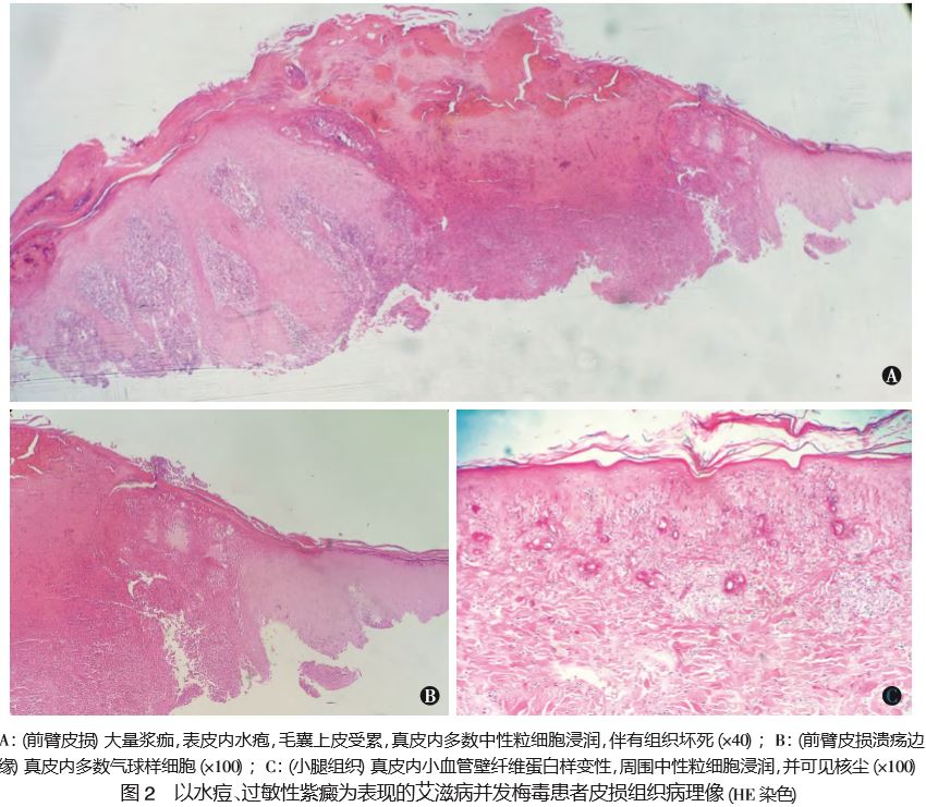 、 消化及泌尿系统超声、胸部正位 X 线片无异常;前臂 皮损组织病理:大量浆痂,表皮内水疱,毛囊上皮受累, 真皮内多数中性粒细胞浸润,伴有组织坏死(图 2A);前臂皮损溃疡边缘组织病理:真皮内多数气球样细胞 (图 2B);小腿皮损组织病理:真皮内小血管壁纤维蛋 白样变性,周围中性粒细胞浸润,并可见核尘(图 2C)。