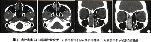 紧贴,骨质未见明显破坏征象,增强后实质部分明显强化,内见低密度无强似轻度强化区,诊断:右侧鼻腔肿物(出血坏死性息肉?血管瘤?其他)。考虑血管瘤可能性大(图1)。完善术前检查,于全麻下行右侧鼻腔新生物切除术,0.1%肾上腺素