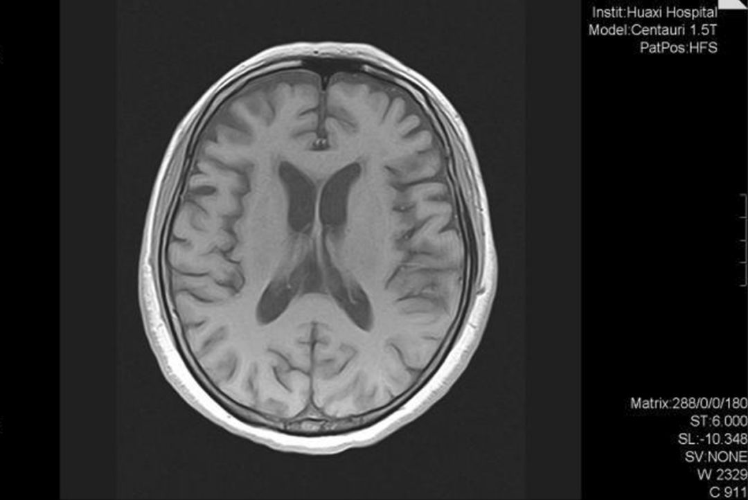 上述情况持续了大约1年后,患者被家人带至我中心门诊就诊。头部磁共振检查未发现明显的大脑结构异常(图1)。根据《精神疾病诊断与统计手册》第五版(DSM-5),患者被诊断为精神分裂症。予以奥氮平5 mg每晚1次,患者服药1个月后幻觉和妄想症状消失,但开始出现行动迟缓,且脖子变得僵硬;同时出现情景性记忆障碍