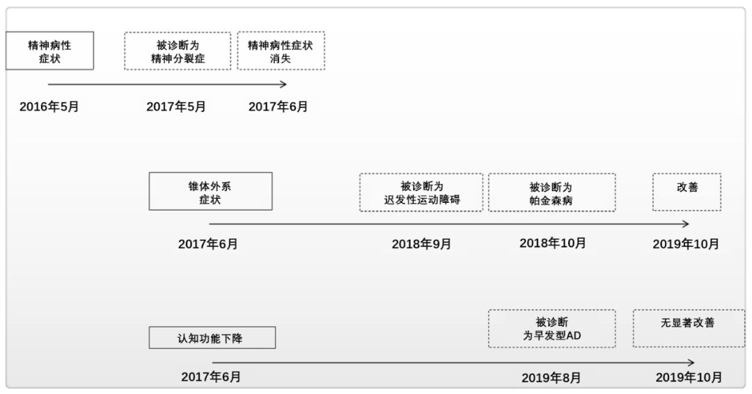 该患者最终被诊断为可能的AD,依据是患者存在早期严重的情景性记忆障碍、内侧颞叶萎缩,并基于PET/CT的脑葡萄糖低代谢,以及AD相关的基因突变。2019年10月的最后一次随访中,患者表现出记忆力差、反应慢和运动迟缓,但没有出现精神病性症状。