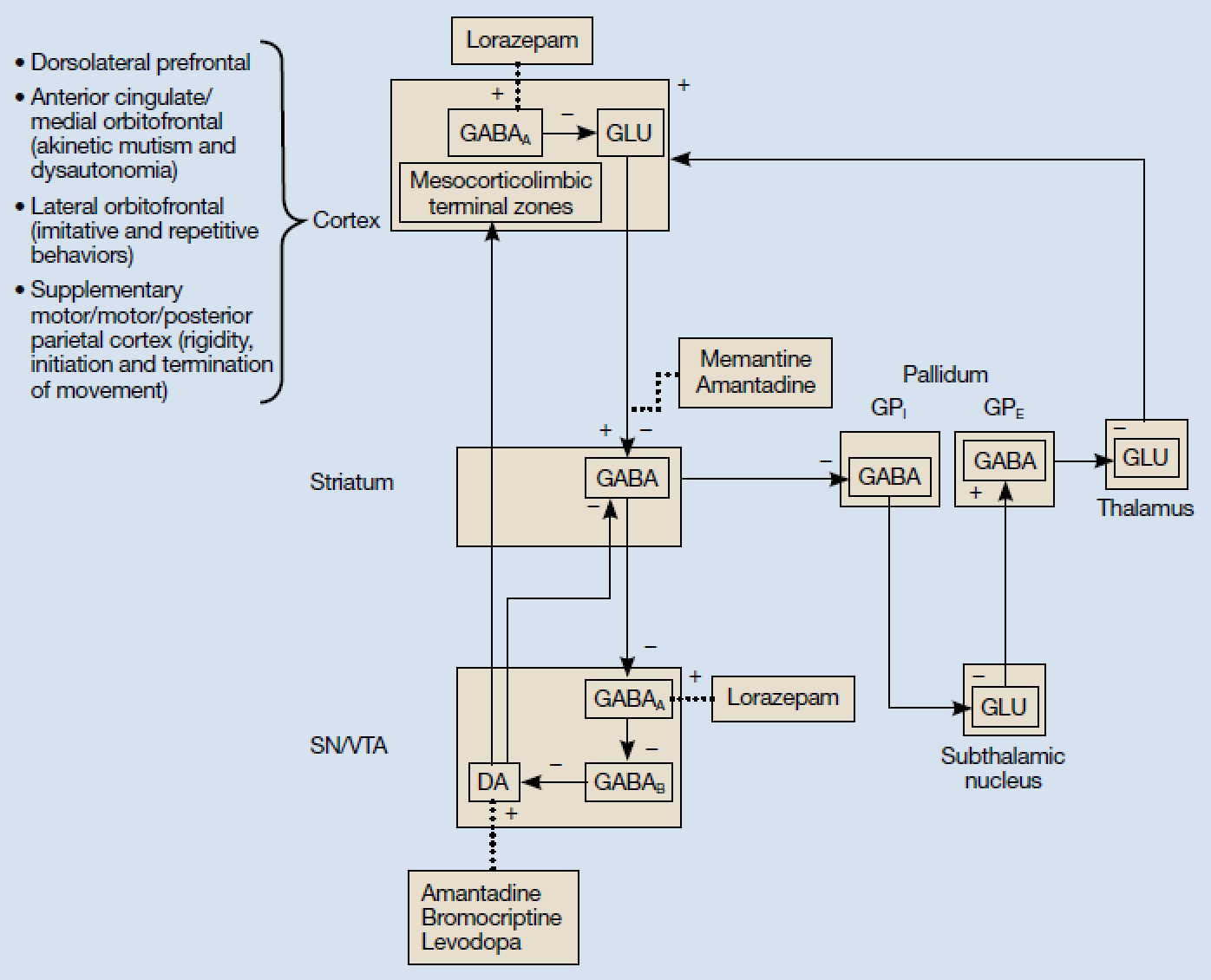 将紧张症视为一种基底节疾病,患者基底节丘脑皮质束及前扣带回/内侧眶额回路出现病变,这一模型有助于我们更好地理解紧张症。上述通路功能的紊乱可导致缄默、重复行为、模仿行为等。上述现象的机制可能是GABA能下降造成的低多巴胺能状态,这也可以解释,苯二氮䓬类药物(可增强GABA能)为何可有效治疗紧张症,而抗精神病药(可阻断多巴胺能)为何加重症状。