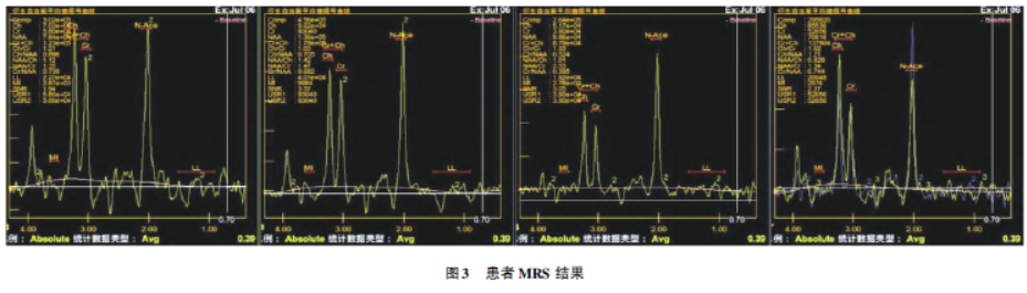 MRS示,左侧大脑半球多发异常信号灶,病变区NAA峰下降,Cho峰稍升高,Cho/NAA约2.97(图3)。结合患者临床表现及MRI和MRS,考虑大脑恶性肿瘤性病变,炎症性疾病待排除。