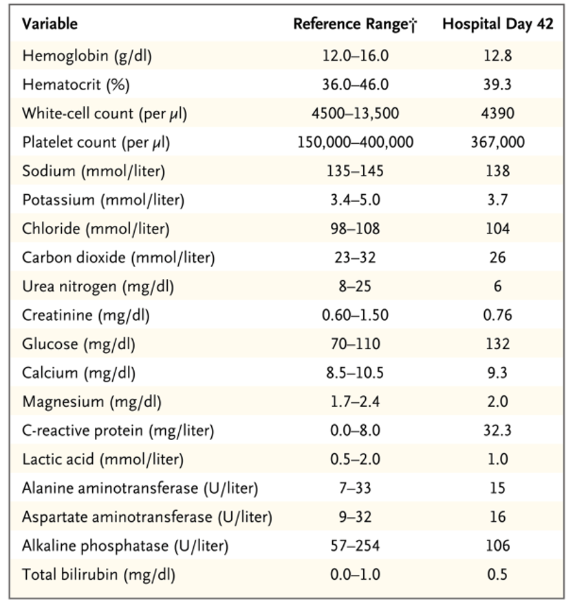 入院42日早上,患者血压为146/87 mmHg,心率为52次/分钟。无新症状出现,诊断不变。12小时后,患者自诉不适,站立时有头晕,并有恶心和腹痛,查体:血压69/39 mmHg,心率88次/分钟,患者面色苍白,疲惫不堪,昏昏欲睡,考虑“低血压“发作,遂予口服补液1小时后,复测患者血压: 94/50 mmHg,心率:88次/分钟。3小时后复测患者血压为79/45 mmHg,心率为85次/分钟。