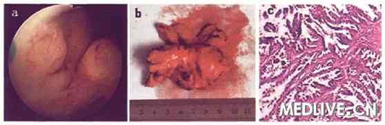 图1 a:经尿道肿物电切术中见肿瘤呈乳头状突入尿道;b:前列腺根治性切除标本可见右侧叶靠近尖部有一直径约2cm肿物;c:术后病理HE染色见肿瘤细胞呈分支乳头状、腺管状,类似尿道乳头状腺癌