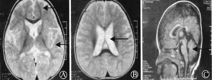 示以右侧后头部为主较多量多棘慢波发放。颅脑MRI示双侧侧脑室扩大,弥漫性脑沟深,脑回细,脑白质偏少,脑萎缩(图)。