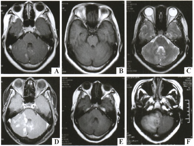 头颅MRI:2012年8月21日MR增强示右侧小脑脑干多发异常信号影,较2012年7月19日明显进展。2012年8月31日头颅MRI示右侧脑干、右侧小脑半球及小脑蚓部见异常信号,建议行头颅MR增强检查。MRI示双侧基底节区及额顶叶白质内腔隙性缺血灶(图2)。
