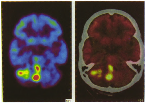 头颅PET:2012年9月1日示右侧小脑半球不规则混杂密度占位,边界不清,压迫第四脑室,PET上呈多发结节状放射性摄取异常增高,余未见明显放射性异常(图3)。