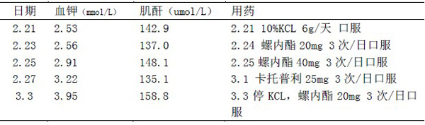 2、生化检查示(2.21):血肌酐142.9umol/L,尿素6.45mmol/L,血钾2.53mmol/L,血钠138.2mmol/L。