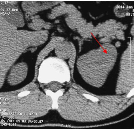 4、B 超和CT是最常用的影像检查手段。B超检查病变可表现为肾皮质内低或中强各种回声。本次报告的第二例患者可能由于存在瘤体内的出血而显示不均质回声。CT平扫+动态增强扫描是有效的定位诊断方法,敏感性接近100%。CT平扫常表现稍低至等密度,增强后在动脉期常与肾实质其他部位一致,但在门脉期或延迟期可有轻-中度强化而与周期肾实质存在差异。