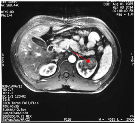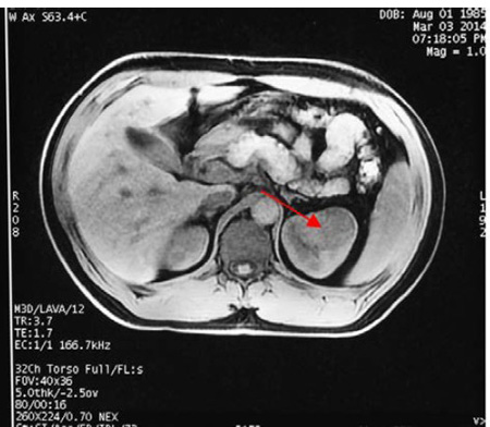 6.85mmol/L、钾3.21mmol/L;行肾上腺CT平扫