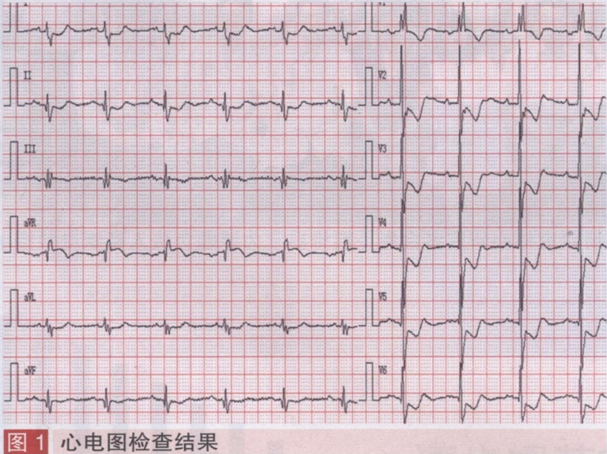 心电图检查:窦性心律,右束支传导阻滞,ST段I、Ⅱ、V2-6下斜型压低0.1-0.3 mv,aVR抬高0.1 mv,伴T波改变(图1)。