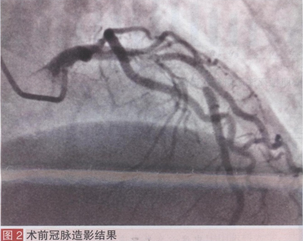 600mg,普通肝素100 IU/kg。冠脉造影示三支病变:左冠脉前降支(LAD)近段90-99弥漫性狭窄,前向TIMI血流3级(图2),左冠脉回旋支近段75%-85%带段性狭窄,前向TIMI血流3级,右冠脉近段60%-70%局限性狭窄,前向TIMI血流3级。