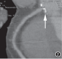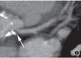 图2 右冠状动脉开口部可见钙化,管腔局限性重度狭窄(箭)。