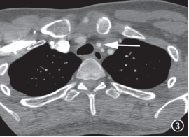 图3 头臂动脉管壁增厚,以左颈总动脉为著(箭)。