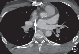 图4 主动脉瓣上管壁钙化,管径小于同水平降主动脉(箭)。