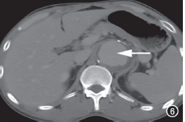 图6 降主动脉管径增宽,管壁增厚,管腔不规则(箭)。