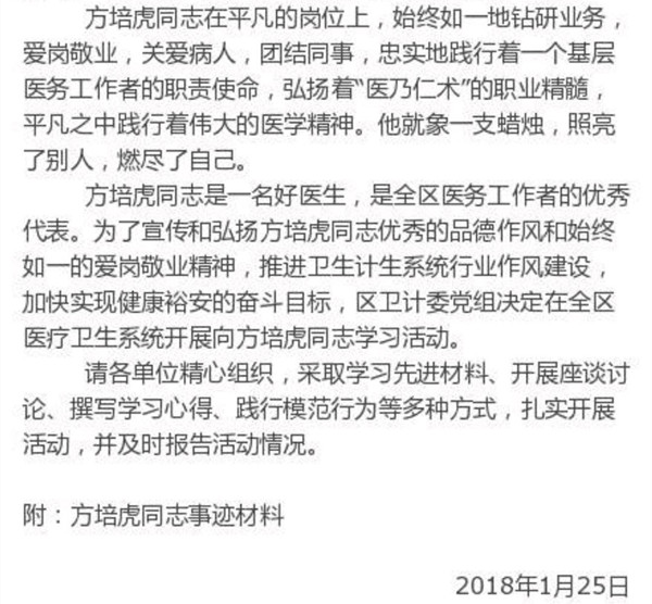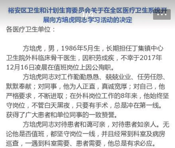 后,当地裕安区卫计委发文,要求全体医务工作者向他学习。全文如下: