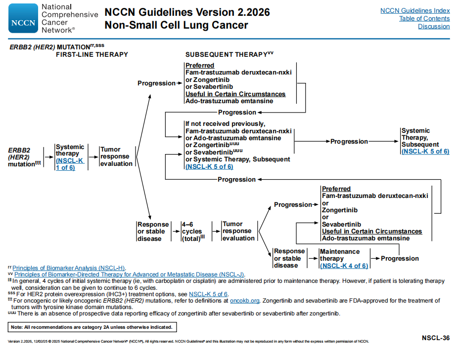 对于既往接受过系统治疗的携带ERBB2(HER2)突变的晚期NSCLC患者,新增Sevabertinib作为后续治疗优选。