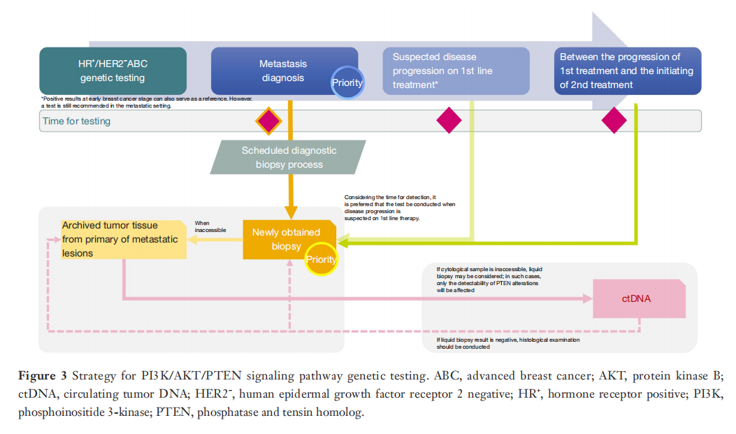 检测时机:专家建议PI3K/AKT/PTEN通路基因检测越早越好,国际指南推荐首次诊断转移时检测,结合临床实际,可在二线治疗启动前或一线治疗疑似进展时进行(图3)。