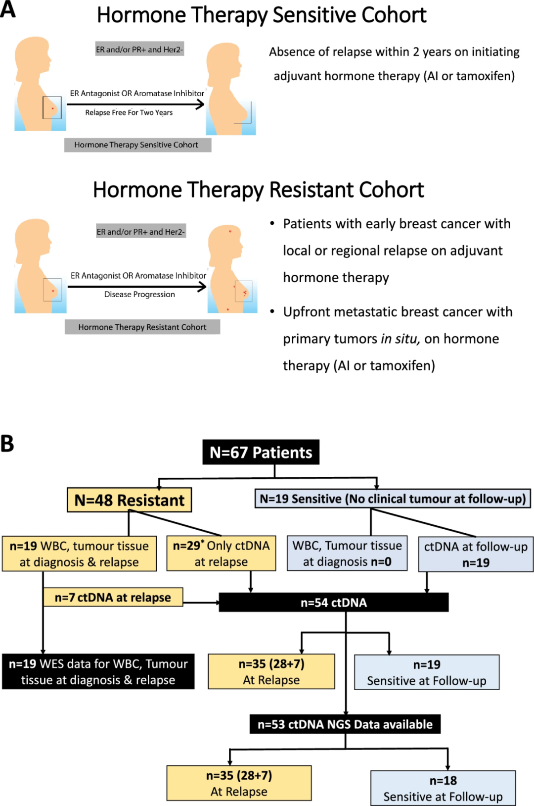 本研究为单中心前瞻性研究,收集了经组织病理学证实为乳腺癌的患者的样本和数据,这些患者经免疫组化检测为ER和/或PR阳性,且经免疫组化或荧光原位杂交检测为HER2阴性。所有早期或局部晚期乳腺癌(LABC)患者均接受了标准根治性治疗,包括手术,联合或不联合(新)辅助化疗、放疗(如有指征)以及辅助内分泌治疗。如果患者在开始内分泌治疗后至少2年内无复发,则被归类为内分泌治疗敏感型。采集了这些患者诊断时的血液、口腔拭子样本和先前存档的肿瘤组织。如果在内分泌治疗期间出现疾病进展或在开始内分泌治疗2年内出现疾病复发,则患者被归类为内分泌治疗耐药型疾病。同样收集了这些患者的血液、口腔拭子和最易获取的复发部位的肿瘤组织(图1)。