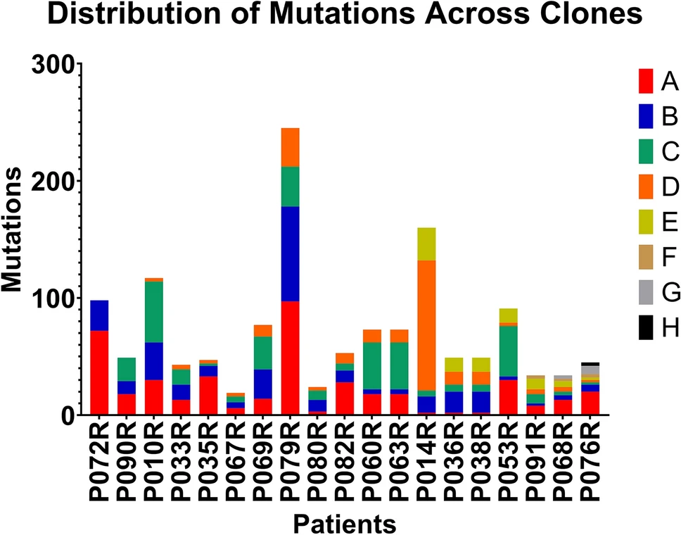 图3. 19例患者配对初治和复发部位组织活检WES数据中各克隆的突变分布[2]
