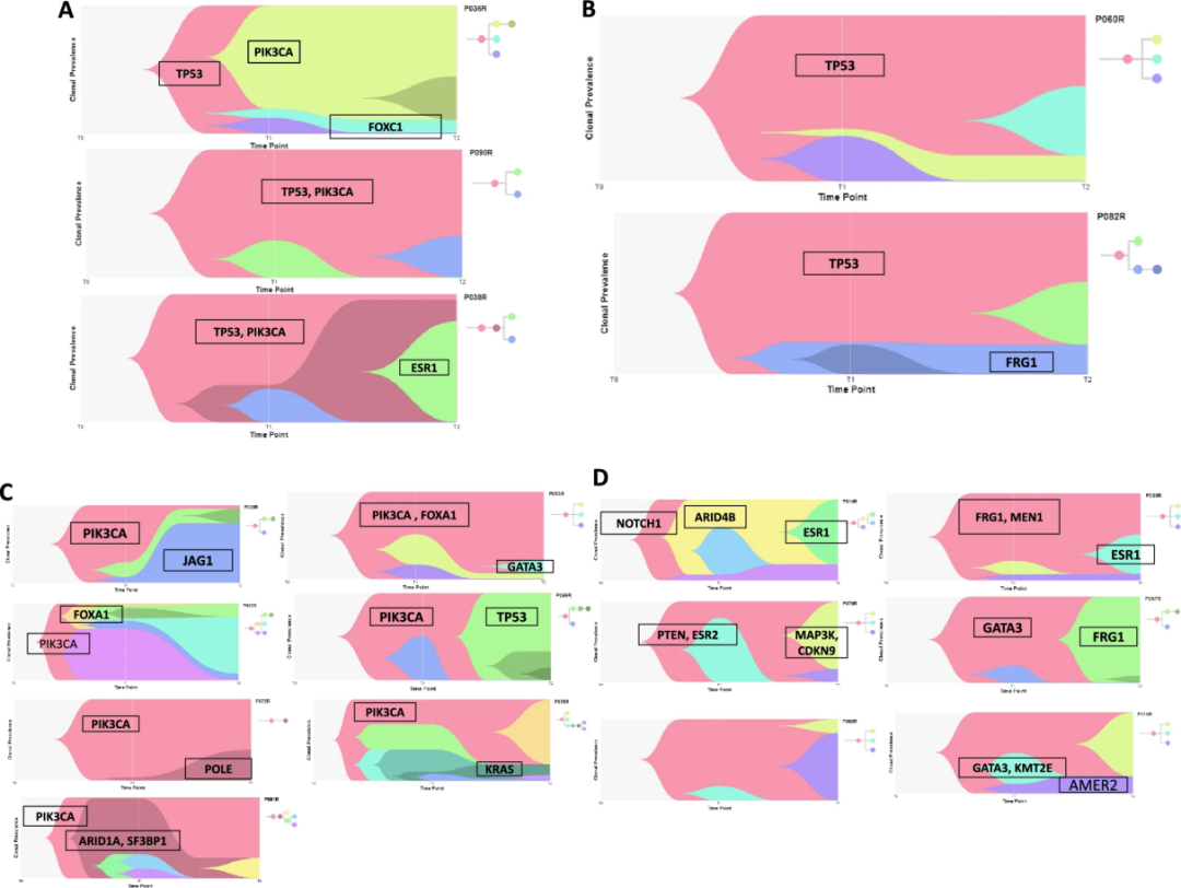 内分泌治疗耐药患者的初治肿瘤样本呈多克隆性,突变负荷各异(图3),由一个原始克隆分化为亚克隆(图4)。这种“分支进化”模式在18例(94.7%)患者中观察到。其余1例(5.3%)患者的初治肿瘤为双克隆,并在复发时保持不变。我们根据原始克隆中是否存在PIK3CA和/或TP53突变对患者进行分类。13例(68.4%)患者的原始克隆携带PIK3CA或TP53突变,或两者兼有。A组患者包括3例(15.8%)原始克隆中同时存在TP53和PIK3CA突变的患者(图4A),这些患者的原始克隆中缺乏其他驱动突变,表明PIK3CA和TP53突变在其整个临床过程中且持续存在,驱动治疗耐药。这3例患者中的1例(5.3%)(P038R)在复发时获得了ESR1突变(p.Y537S)。B组患者包括3例(15.8%)仅携带TP53突变且无PI3K通路突变的患者(图4B)。这些患者的原始克隆中有额外的GATA3、RAD54和AMER1突变。C组包含8例(42.1%)患者,其原始克隆中仅有PIK3CA突变,而无TP53突变(图4C)。其中5例(26.3%)患者的原始克隆中存在其他原癌基因(JAG1、RAF1、KRAS和FOXA1)的额外突变;2例(10.5%)患者存在DNA损伤修复(DDR)基因(RAD18、XRCC5)、原癌基因(MAP3K21、MAP2K5、PDGFRL)和抑癌基因(PTEN)的突变;1例(5.3%)患者存在ESR2突变(R220W);1例(5.3%)患者在复发时获得了两个TP53突变(R141C和E66X)。D组包含5例(26.3%)患者,其原始克隆中缺乏TP53或PIK3CA突变(图4D),但存在FOXA2、NOTCH1、PTEN、GATA3、MEN1、FRG1和MAP3K等已知驱动突变。2例(10.5%)D组患者的复发部位肿瘤组织获得了一个ESR1热点突变。此外,在2例(10.5%)患者(P080R和P069R)中,原始克隆中未发现任何已知的驱动突变。