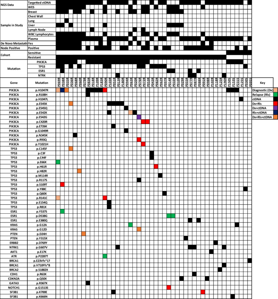 因此,总体而言,这54例患者中有31例(耐药27,敏感4,57.4%)携带PIK3CA或TP53突变,其中28例(耐药25,敏感3,51.9%)患者可见潜在的可靶向改变。