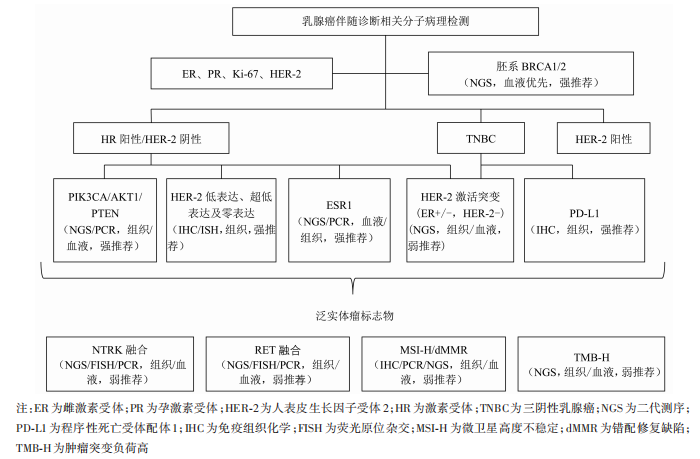 泛实体瘤标志物:《指南》强推荐三阴性乳腺癌患者应进行PD-L1检测以指导治疗方案选择。对于常规分子标志物阴性、且经过标准治疗后疾病仍难以控制的晚期乳腺癌患者,在条件允许的情况下,可考虑进行泛实体瘤分子标志物检测,以期发现潜在靶向治疗机会,例如NTRK/RET融合、MSI-H/dMMR、TMB-H,此类标志物推荐通过NGS大Panel同步检测,提高检测效率。