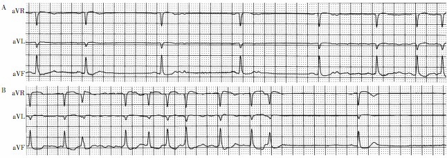 患者男性,61岁。临床诊断:心律失常,心房颤动。A.前5个心搏为窦性,P-R间期158ms,Q-T间期400ms。第2、3、4、5个心搏的T波顶峰可见期前发生的未下传的房性P’波,房性期前收缩未下传心室。最后一个房性期前收缩引发了阵发性心房颤动。B.阵发性心房颤动自行终止,恢复窦性心动过缓伴不齐,心率38次/min。aVFST段呈水平型压低0.10mV。心电图诊断:窦性心律,房性期前收缩未下传,阵发性心房颤动,ST段压低。