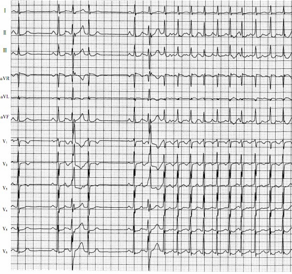 :冠状动脉前降支中段75%节段性狭窄,右冠状动脉中段节段性狭窄。超声心动描记术示:心室壁运动不协调。临床诊断:冠心病,不稳定性心绞痛;心律失常,阵发性心房颤动;心功能Ⅱ级。心电图前两个心搏为窦性,心率58次/min,P-R间期160ms,窦性心动过缓。第3和第4个心搏提前出现,P’-R间期160ms,第3个窦性心搏的T波上出现的房性期前收缩引发了心房颤动。第1个房性期前收缩和心房颤动开始的QRS波群呈右束支传导阻滞型心室内差异性传导。Ⅱ、Ⅲ、aVF、V4~V5 ST段压低0.05~0.10mV,V1~V3T波倒置,V4、V5T波低平。心电图诊断:窦性心动过缓;ST-T改变;阵发性心房颤动伴心室内差异性传导;成对房性期前收缩伴心室内差异性传导。