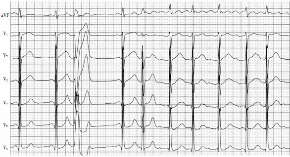 患者男性,65岁。临床诊断:高血压,左心室增大;主动脉瓣轻度反流。第1个心搏为窦性,第2个为加速的房性逸搏,第3个为房性期前收缩伴左束支传导阻滞型心室内差异性传导。发生于T波上的房性期前收缩诱发了心房颤动。心电图诊断:窦性心律;房性期前收缩伴左束支传导阻滞型心室内差异性传导;P’onT房性期前收缩引发阵发性心房颤动。