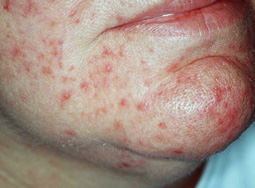 也会出现红斑和毛细血管扩张症状,但这两种情况易被忽视。痤疮期与青春痘、溴疹碘疹、口周皮炎和脓疱性毛囊炎相似。皮肤活检可用于区分其他皮肤疾病如狼疮或肉状瘤病。