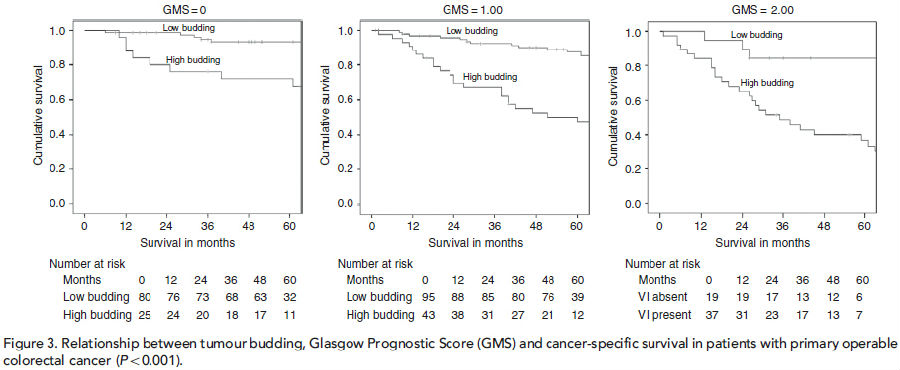 高级别肿瘤出芽在39%的所有肿瘤和28%的淋巴结阴性肿瘤中出现。高级别出芽显著与T分期(P<0.001),N分期(P<0.001),TMN分期(P<0.001),浆膜受累(P<0.001),静脉浸润(P<0.005),KM分级(P=0.022),肿瘤基质高(P<0.001)和GMS(P<0.001)有关。肿瘤出芽与减少的癌症特异性存活率(CSS)(HR=4.03;95% 置信区间[CI],2.50-6.52;P<0.001),独立的年龄(HR=1.47;95% CI,1.13-1.90;P=0.004),TMN分期(HR=1.52,;95% CI,1.02-2.25;P=0.040),静脉浸润(HR=1.73;95% CI,1.13-2.64;P=0.012)和GMS(HR=1.54;95% CI,1.15-2.07;P=0.04)具有相关性。