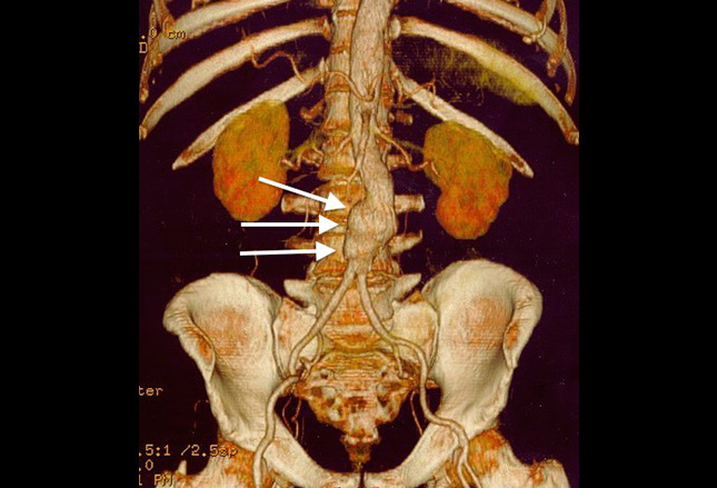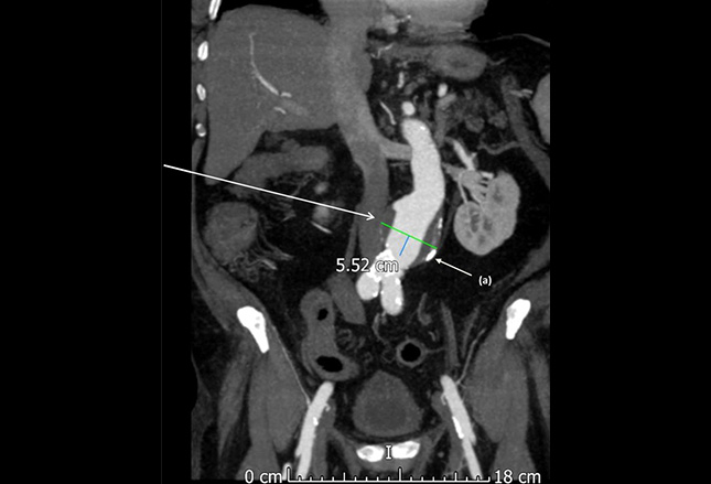 CT扫描对比揭示了无症状的老年男性中的腹主动脉瘤。动脉瘤壁上和远端主动脉(a)有钙化的动脉粥样硬化斑块。
