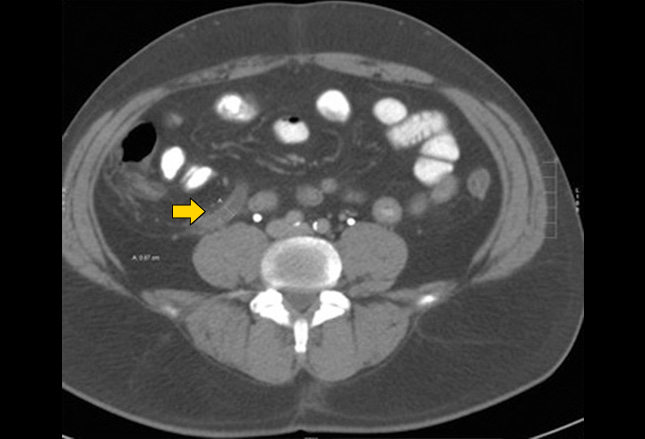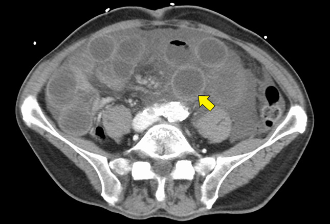 CT扫描描绘了肠系膜上静脉血栓形成的肠缺血。可见肠壁增厚(箭头)伴肠壁扩张。