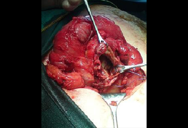 术中图像显示在盲肠底部较大的阑尾穿孔。