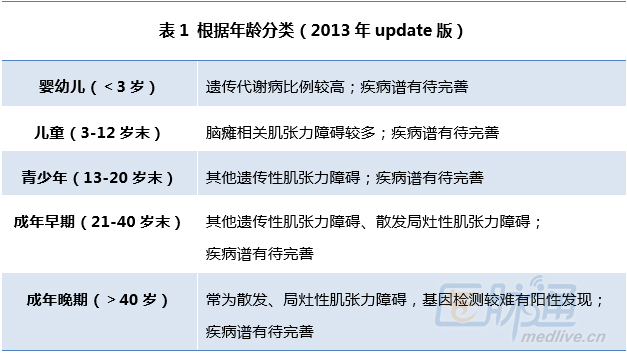 那为啥还要重新分类呢?因为大牛们认为:如此简单的一个或几个年龄分类不能体现肌张力障碍的所有特点。比如说:1~2岁前起病的婴幼儿遗传代谢病的比例很高,预后差;2~6岁发病的,尤其是2岁以前有生长发育迟滞的可能与脑瘫相关,比如说有出生时窒息、难产史的;其他肌张力障碍比如说多巴反应性肌张力障碍多在儿童或青少年起病。而中年后期多表现为散发的局灶性肌张力障碍。