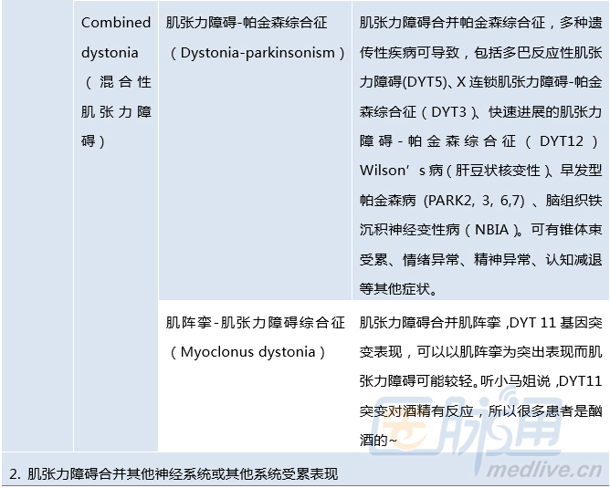 孤立肌张力障碍是指除了可有震颤以外,肌张力障碍是其唯一的运动症状;混合性肌张力障碍是指肌张力障碍合并其他运动障碍,如肌阵挛、帕金森综合征。注意,运动障碍≠运动系统功能异常,前文也说过,运动障碍疾病是局限于锥体外系的。